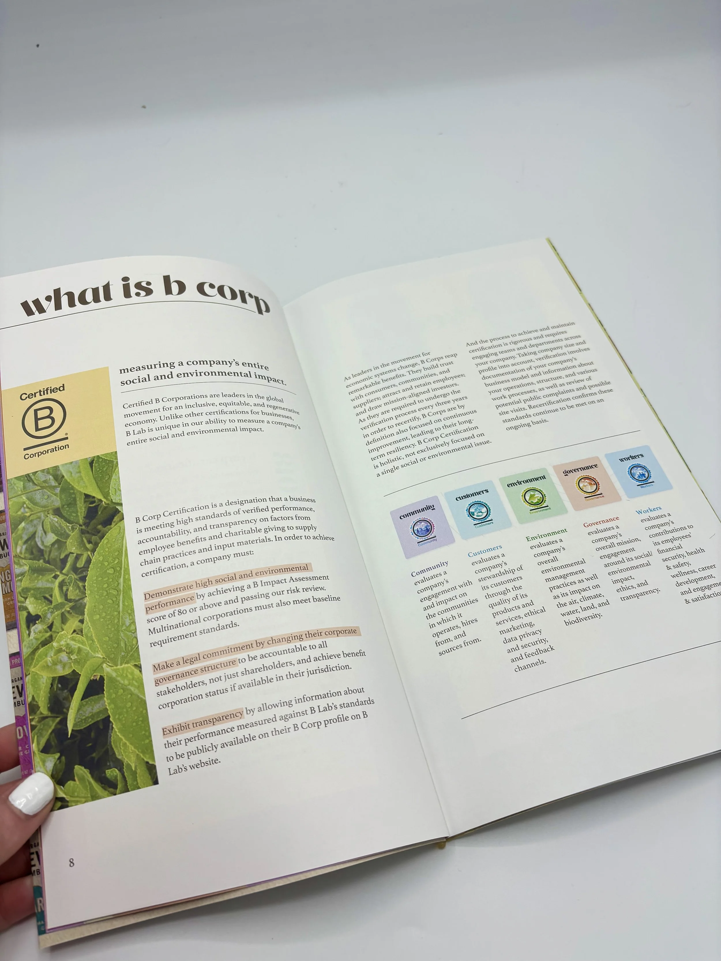 For me, the process begun with research into the company’s B-Corp certification and sustainability initiatives, ensuring alignment with their brand identity and values. I aimed for the design and branding to prioritize visual appeal while maintaining alignment with the company’s aesthetic. The iterative process included creating mood boards, a multiple print drafts with critique and revision to get to the final booklet.